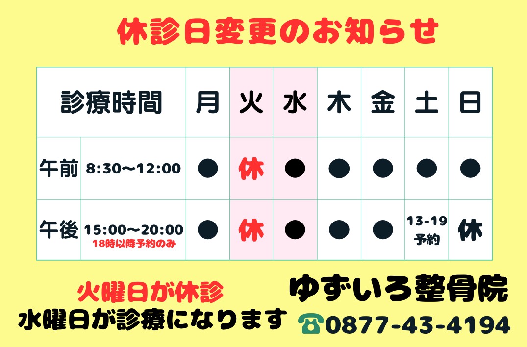 2025.9.9より下記の通り休診日を変更させて頂きます。